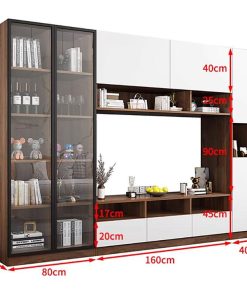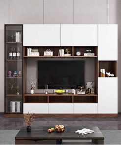 Bộ tủ tivi này bao gồm 01 kệ tivi, 02 tủ phụ lớn ở bên gắn cùng 01 tủ treo. Toàn bộ các phần tủ kệ này được lắp ghép lại với nhau để tạo nên kết cấu tủ hình chữ nhật khép kín rất độc đáo.