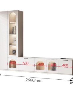 Bộ tủ kệ mang kiểu dáng chữ L sang chảnh, kết hợp giữa tủ ngăn gỗ và cánh kính sọc có đèn led càng làm tăng thêm sự trang trọng, tiện nghi cho mẫu sản phẩm.