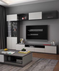 Bộ tủ tivi này bao gồm 01 kệ tivi, 01 tủ phụ lớn ở bên gắn cùng 01 tủ treo. Toàn bộ các phần tủ kệ này được lắp ghép lại với nhau để tạo nên kết cấu tủ hình chữ U nằm ngang rất độc đáo.
