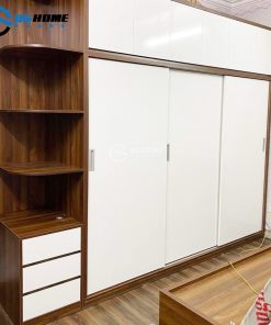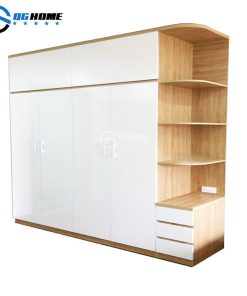 Tủ được chia thành 2 khoang tủ trên và 2 khoang tủ dưới để treo quần áo. Bên cạnh tủ được thiết kế kệ trang trí và ngăn kéo, cung cấp không gian lưu trữ rộng rãi và thuận tiện cho việc sắp xếp đồ đạc.