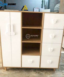 Với kích thước nhỏ gọn 1m25x1m2, tủ dễ dàng hòa mình vào không gian phòng ngủ mà không chiếm quá nhiều diện tích. Thiết kế tinh tế với các ô ngăn kéo và khoang treo quần áo rộng rãi giúp bạn dễ dàng sắp xếp và phân loại trang phục cho bé. Các chi tiết trên tủ, từ tay cầm đến đường viền, đều được chăm chút kỹ lưỡng, mang đến vẻ đẹp hài hòa và thân thiện với trẻ nhỏ.