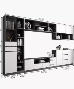 Kích thước: Tủ treo: 3050 x 320 x 700mm / Tủ đứng cao: 600 x 320 x 2000mm /Tủ đứng thấp: 1050 x 320 x 800mm /Kệ tivi: 1400 x 320 x 420mm