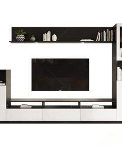 Quy cách: Kệ tivi: 03 ngăn tủ, 03 ngăn kéo/ Tủ thấp: hộc tủ và tủ cánh mở/ Tủ cao: 02 tủ cánh mở (mỗi tủ 02 ngăn) kèm 01 hộc tủ ở giữa Kệ treo chữ L