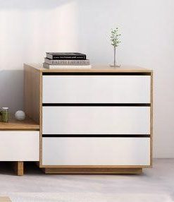 Phần kệ tivi gồm 3 ngăn kéo được thiết kế khá đơn giản, bên cạnh kệ tivi là một ván gỗ chữ L đi kèm và một hộc tủ phụ. Để tiết kiệm diện tích, bộ kệ tivi còn bao gồm một kệ treo tường phía trên tivi.